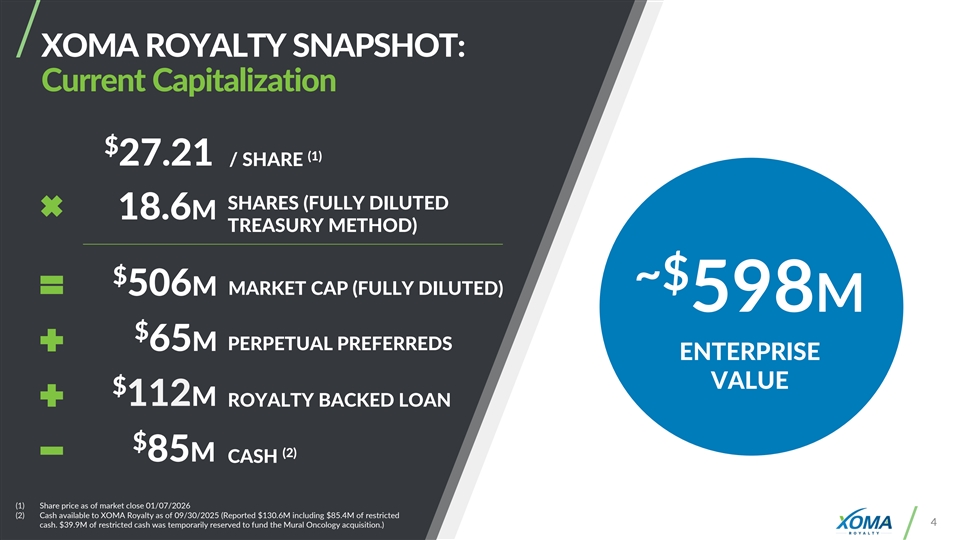 XOMA ROYALTY SNAPSHOT: Current Capitalization $ (1) 27.21 / SHARE SHARES (FULLY DILUTED 18.6M TREASURY METHOD) $ ~$ MARKET CAP (FULLY DILUTED) 506M 598M $ 65M PERPETUAL PREFERREDS ENTERPRISE VALUE $ 112M ROYALTY BACKED LOAN $ (2) 85M CASH (1) Share price as of market close 01/07/2026 (2) Cash available to XOMA Royalty as of 09/30/2025 (Reported $130.6M including $85.4M of restricted 4 4 cash. $39.9M of restricted cash was temporarily reserved to fund the Mural Oncology acquisition.)