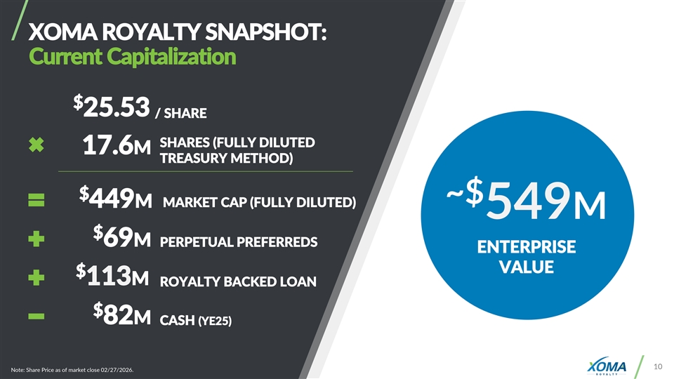 XOMA ROYALTY SNAPSHOT: Current Capitalization $ 25.53 / SHARE SHARES (FULLY DILUTED 17.6M TREASURY METHOD) $ ~$ MARKET CAP (FULLY DILUTED) 449M 549M $ 69M PERPETUAL PREFERREDS ENTERPRISE VALUE $ 113M ROYALTY BACKED LOAN $ 82M CASH (YE25) 10 10 Note: Share Price as of market close 02/27/2026.