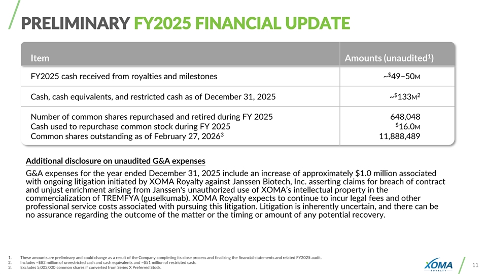 PRELIMINARY FY2025 FINANCIAL UPDATE 1 Item Amounts (unaudited ) $ FY2025 cash received from royalties and milestones ~ 49–50M $ 2 Cash, cash equivalents, and restricted cash as of December 31, 2025 ~ 133M Number of common shares repurchased and retired during FY 2025 648,048 $ Cash used to repurchase common stock during FY 2025 16.0M 3 Common shares outstanding as of February 27, 2026 11,888,489 Additional disclosure on unaudited G&A expenses G&A expenses for the year ended December 31, 2025 include an increase of approximately $1.0 million associated with ongoing litigation initiated by XOMA Royalty against Janssen Biotech, Inc. asserting claims for breach of contract and unjust enrichment arising from Janssen's unauthorized use of XOMA’s intellectual property in the commercialization of TREMFYA (guselkumab). XOMA Royalty expects to continue to incur legal fees and other professional service costs associated with pursuing this litigation. Litigation is inherently uncertain, and there can be no assurance regarding the outcome of the matter or the timing or amount of any potential recovery. 1. These amounts are preliminary and could change as a result of the Company completing its close process and finalizing the financial statements and related FY2025 audit. 2. Includes ~$82 million of unrestricted cash and cash equivalents and ~$51 million of restricted cash. 11 3. Excludes 5,003,000 common shares if converted from Series X Preferred Stock.