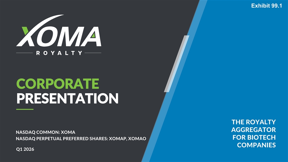 Exhibit 99.1 CORPORATE PRESENTATION THE ROYALTY AGGREGATOR NASDAQ COMMON: XOMA FOR BIOTECH NASDAQ PERPETUAL PREFERRED SHARES: XOMAP, XOMAO COMPANIES Q1 2026