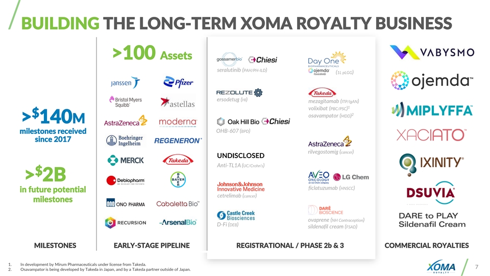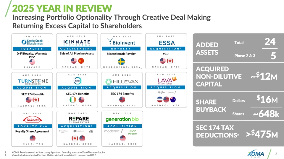 2025 YEAR IN REVIEW Increasing Portfolio Optionality Through Creative Deal Making Returning Excess Capital to Shareholders A P R 2 0 2 5 J U L 2 0 2 5 J A N 2 0 2 5 M A Y 2 0 2 5 Total 24 ADDED 1 O U T L I C E N S I N G R O Y A L T Y A C Q U I S I T I O N R O Y A L T Y + D-Fi Royalty, Warrants Sale of All Pipeline Assets ASSETS Mezagitamab Royalty Cash Phase 2 & 3 PRV 5 N A S D A Q : K N T E N A S D A Q : E P I X P R I V A T E N A S D A Q ( S W ) : B I N V ACQUIRED A U G 2 0 2 5 A U G 2 0 2 5 A U G 2 0 2 5 A U G 2 0 2 5 $ NON-DILUTIVE ~ 12M CAPITAL A C Q U I S I T I O N A C Q U I S I T I O N A C Q U I S I T I O N A C Q U I S I T I O N SEC 174 Benefits SEC 174 Benefits SEC 174 Benefits $ Dollars 16M SHARE N A S D A Q : M U R A N A S D A Q : L V T X N A S D A Q : T S B X N A S D A Q : H L V X BUYBACK D E C 2 0 2 5 N O V 2 0 2 5 D E C 2 0 2 5 Shares ~648k 1 R O Y A L T Y X - Δ A C Q U I S I T I O N A C Q U I S I T I O N SEC 174 TAX ctLNP Royalty Share Agreement Platform $ 2 DEDUCTIONS > 475M N Y S E : T A K N A S D A Q : R P R X N A S D A Q : G B I O 1. XOMA Royalty served as Structuring Agent and financing source to XenoTherapeutics, Inc. 6 2. Value includes estimated Section 174 tax deductions related to unamortized R&E