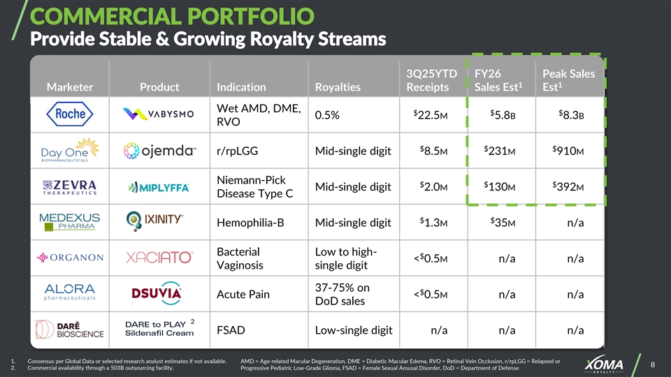 BUILDING THE LONG-TERM XOMA ROYALTY BUSINESS >100 Assets seralutinib (PAH/PH-ILD) (1L pLGG) ersodetug (HI) mezagitamab (ITP/IgAN) 1 volixibat (PBC/PSC) 2 $ osavampator (MDD) > 140M OHB-607 (BPD) milestones received since 2017 rilvegostomig (cancer) UNDISCLOSED Anti-TL1A (UC/Crohn’s) $ > 2B ficlatuzumab (HNSCC) in future potential cetrelimab (cancer) milestones ovaprene (NH Contraception) D-Fi (DEB) sildenafil cream (FSAD) MILESTONES EARLY-STAGE PIPELINE REGISTRATIONAL / PHASE 2b & 3 COMMERCIAL ROYALTIES 1. In development by Mirum Pharmaceuticals under license from Takeda. 7 2. Osavampator is being developed by Takeda in Japan, and by a Takeda partner outside of Japan.